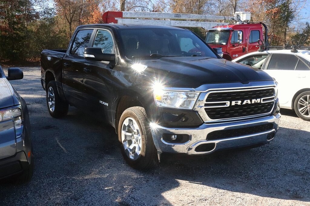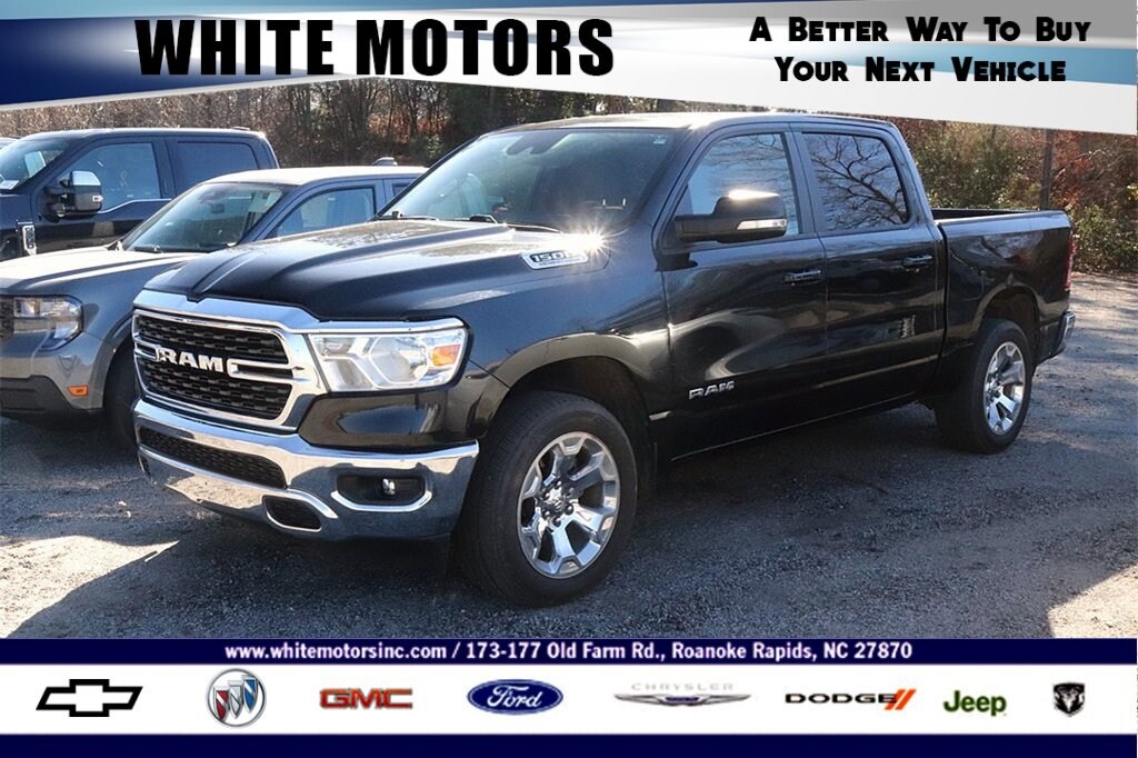 Recent Arrival! All Routine Maintenance Up To Date. 2022 Ram 1500 Big Horn/Lone Star Diamond Black Crystal PearlcoatEquipped with Big Horn Level 1 Equipment Group (2nd Row In Floor Storage Bins, 4G LTE Wi-Fi Hot Spot, 8.4 Touchscreen Display, Apple CarPlay, Auto-Dimming Exterior Driver Mirror, Auto-Dimming Rear-View Mirror, Black Exterior Mirrors, Black Premium Power Mirrors, Bluetooth Handsfree Phone & Audio, Class IV Receiver Hitch, Cluster 3.5 TFT Color Display, Connectivity - US/Canada, Convex Wide-Angle Mirror Insert, Exterior Mirrors Courtesy Lamps, Exterior Mirrors w/Heating Element, Exterior Mirrors w/Supplemental Signals, For Details, Visit DriveUconnect.com, Global Telematics Box Module (TBM), Glove Box Lamp, Google Android Auto, GPS Antenna Input, Integrated Center Stack Radio, Power 2-Way Driver Lumbar Adjust, Power 8-Way Driver Seat, Power Adjustable Pedals, Power-Folding Mirrors, Radio: Uconnect 5 W w/8.4 Display, Rear Dome w/On/Off Switch Lamp, Rear Power Sliding Window, Rear Window Defroster, SiriusXM Radio Service, SiriusXM Satellite Radio, Sun Visors w/Illuminated Vanity Mirrors, Universal Garage Door Opener, and USB Host Flip), Level 1 Safety Group (Advanced Brake Assist, Full Speed Forward Collision Warning Plus, Lane Keep Assist, and Pedestrian Emergency Braking), Quick Order Package 27Z Big Horn (Big Horn Badge), Trailer Tow Group (Trailer Brake Control, Trailer Light Check, and Trailer Tire Pressure Monitoring System), 3 Rear Seat Head Restraints, 3.21 Rear Axle Ratio, 4 Way Front Headrests, 4-Wheel Disc Brakes, 48V Belt Starter Generator, 6 Speakers, ABS brakes, Air Conditioning, Air Conditioning ATC w/Dual Zone Control, All R1 High Radios, All Radio Equipped Vehicles, Alloy wheels, AM/FM radio, Brake assist, Bumpers: chrome, Cloth Bench Seat, Cluster 7.0 TFT Color Display, Compass, Connected Travel & Traffic Services, Delay-off headlights, Disassociated Touchscreen Display, Driver door bin, Dual front impact airbags, Dual front side impact airbags, Electronic Stability Control, Emergency communication system: SiriusXM Guardian, Front anti-roll bar, Front Center Armrest w/Storage, Front fog lights, Front reading lights, Front Seat Back Map Pockets, Front wheel independent suspension, Fully automatic headlights, GPS Navigation, HD Radio, Heated door mirrors, Heavy-Duty Engine Cooling, Illuminated entry, Integrated Voice Command w/Bluetooth, Leather steering wheel, Low tire pressure warning, MOPAR Front & Rear Rubber Floor Mats, Occupant sensing airbag, Outside temperature display, Overhead airbag, Overhead console, Panic alarm, ParkView Rear Back-Up Camera, Passenger door bin, Passenger vanity mirror, Power door mirrors, Power steering, Power windows, Radio data system, Radio: Uconnect 3 w/5 Display, Radio: Uconnect 5 Nav w/8.4 Display, Rear 60/40 Folding Seat, Rear anti-roll bar, Rear seat center armrest, Rear step bumper, Remote keyless entry, SiriusXM w/360L, Speed control, Split folding rear seat, Steering wheel mounted audio controls, Tachometer, Telescoping steering wheel, Tilt steering wheel, Traction control, Trip computer, Variably intermittent wipers, Voltmeter, Wheels: 18 x 8 Cast-Aluminum Painted, and Wheels: 20 x 9 Aluminum Chrome Clad (WRK)Family owned and operated since 1938.BUY ONLINE-TEXT-EMAIL-CHAT-PHONE. A better way to buy your next vehicle. Where a handshake still means something. Serving Roanoke Rapids, Weldon, Halifax, Scotland Neck, Emporia, South Hill, Franklin, Henderson, Louisburg, Murfreesboro, Littleton, Lake Gaston. We sale nationwide!